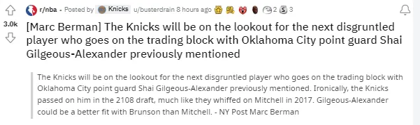 今日根据《纽约邮报》的报道,尼克斯正在寻求其他对自己球队心怀不满的明星球员(disgruntled player),其中有一位就是雷霆的谢伊-吉尔杰斯-亚历山大,尼克斯即将转向展开对SGA的追逐。