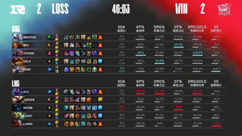 LNG选用:Ale凯南、Tarzan盲僧、Doinb梦魇、Light泽丽、LvMao酒桶