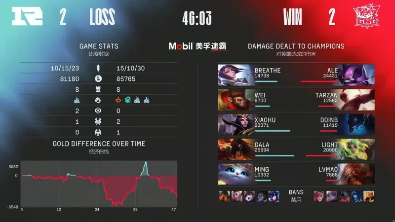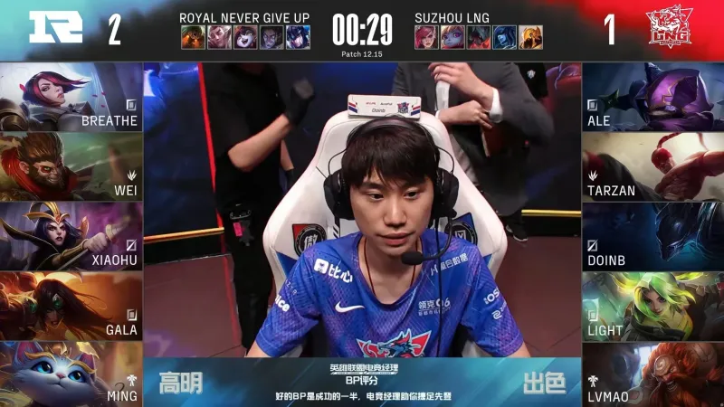 RNG选用:Breathe剑姬、Wei猴子、Xiaohu乐芙兰、GALA希维尔、Ming悠咪