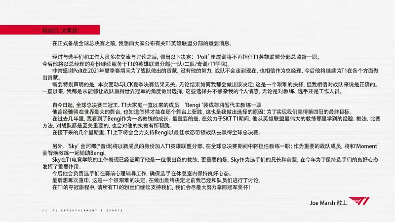 自今日起, 全球总决赛三冠王、 T1大家庭一直以来的成员 Bengi裴成雄将暂代主教练一职。他曾经驰聘在世界最大的舞台, 也知道怎样才能在那个舞台上获胜, 这也是我做出选择的原因:为了实现我们赢得第四冠的最终目标。在过去几年里, 我看到了Bengi作为一名教练的成长。最重要的是, 在效力于SKT T1期间, 他从英雄联盟最伟大的教练那里学到的经验、 教法、 比赛 方法, 对战队都是至关重要的, 也会对他的执教有所帮助。
