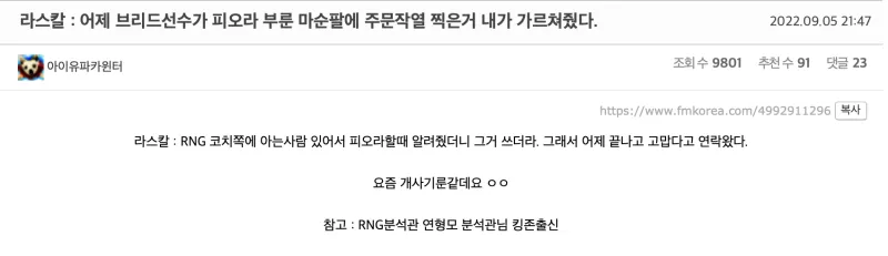Rascal:“昨天Breathe选手使用剑姬附系点了法力流系带和焦灼,这是我教他的,我跟RNG教练认识,所以在玩剑姬时告诉他了,Breathe选手就用了诶。昨天比赛结束之后,向我传达了感谢。这是最近非常OP的符文。”