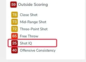 2KRatings中,威斯布鲁克的外线得分综合评分仅有59,其中投篮智商的25是全联盟最低,进攻稳定性也仅有40,这些都是极低的数值。