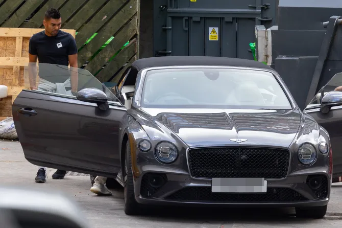 卡塞米罗在一旁自己的新座驾处等候,这是一辆宾利2022年新款GTC Speed convertible,售价为20万英镑。
