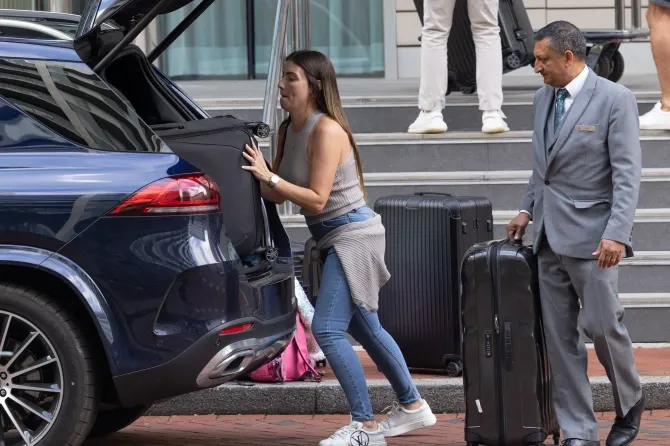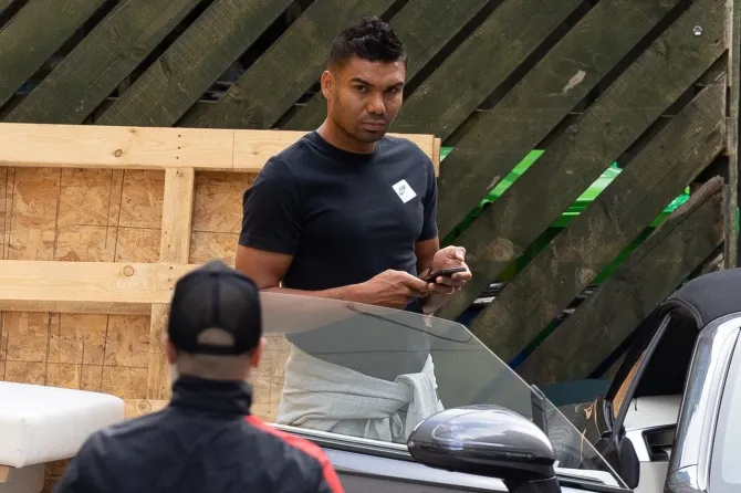 卡塞米罗的妻子安娜-玛利亚娜亲自将多件行李搬到一辆黑色SUV的后备厢里,行李中还有一个印有曼联队徽和老特拉福德字样的袋子。