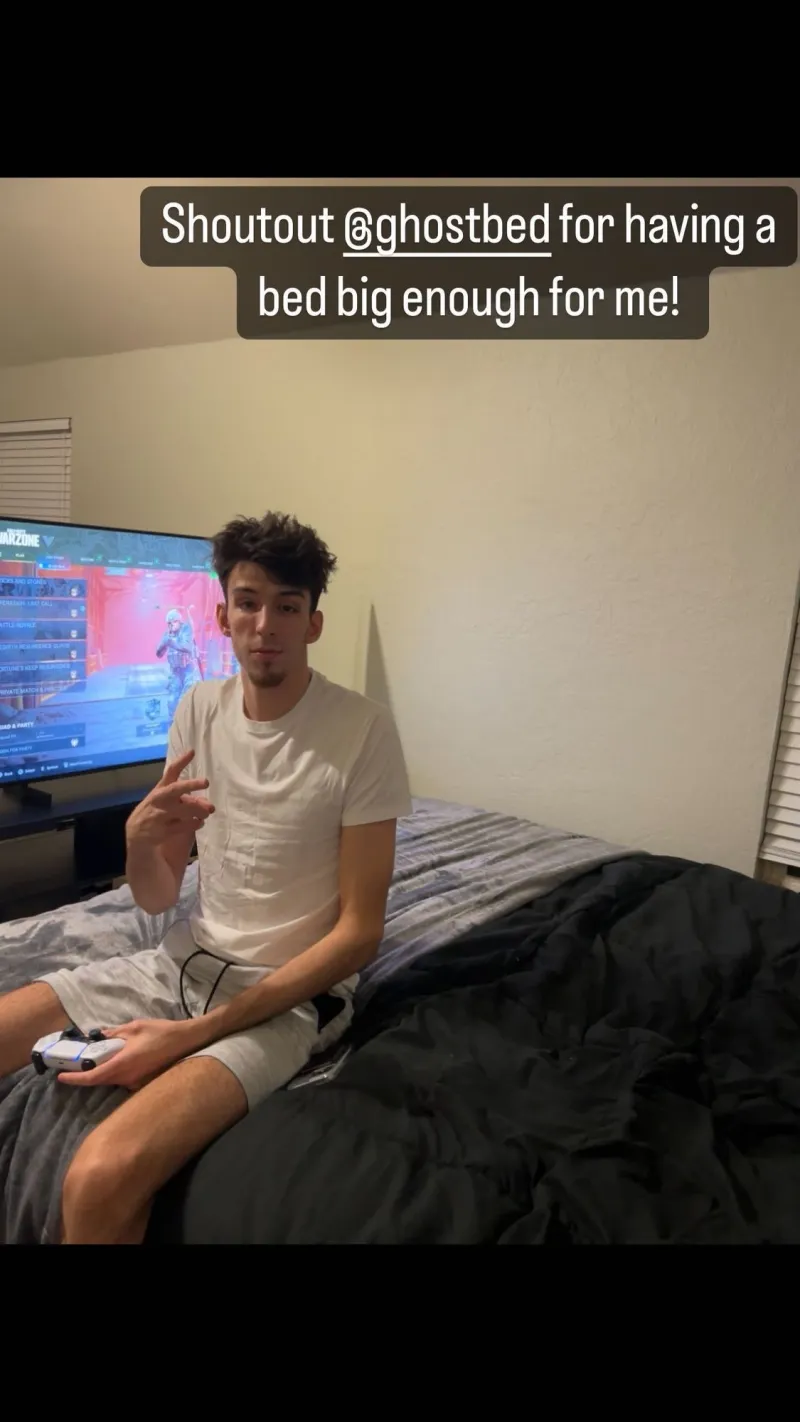 霍姆格伦坐在床上打游戏,配文感谢了一家床的制造商做的床足够大可以容纳他。