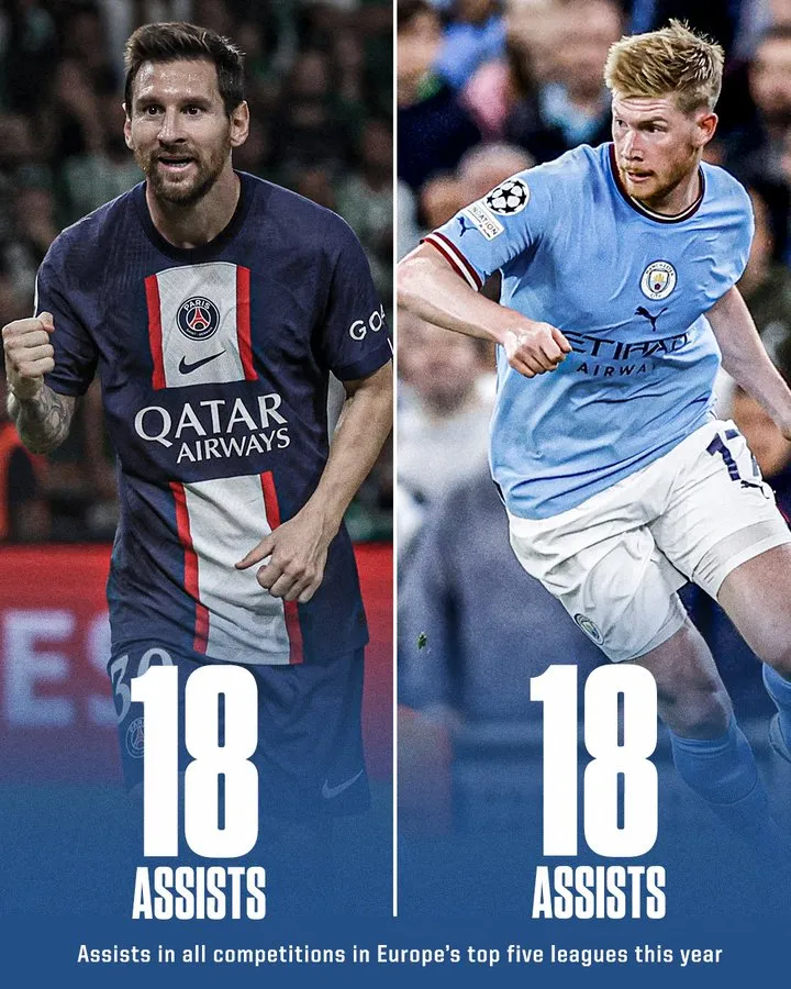 据数据统计,梅西和德布劳内二人2022年至今都获得了18次助攻,并列五大联赛第一。对于助攻的分布,德布劳内为英超11次,欧冠4次,足总杯3次;而梅西则是法甲17次,欧冠1次。