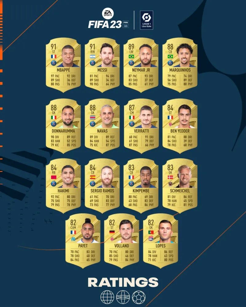 虎扑09月16日讯 EA FIFA 23官方公布了法甲球员能力值的前15榜单,其中巴黎球员梅西和姆巴佩以91分总评并列榜首,共10名巴黎球员进入榜单。
