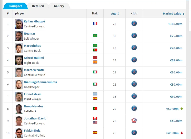 此次身价更新,姆巴佩、内马尔和梅西的身价没有出现变化,姆巴佩依旧以1.6亿欧元的身价领跑法甲和世界足坛。