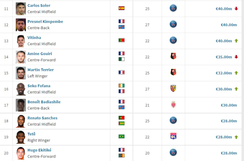 虎扑09月20日讯 德国转会市场网站昨天更新了法甲部分球员的身价,巴黎圣日耳曼夏窗引进的新援维蒂尼亚、埃基蒂克以及去年引进的葡萄牙后卫努诺-门德斯的身价都出现了大幅度的增长,而索莱尔、法比安-鲁伊斯则是出现了身价下跌。