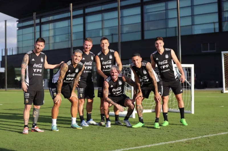 虎扑09月22日讯 在阿根廷队备战友谊赛的梅西更新了自己的Instagram动态,晒出了2张训练照:一张是与迪马利亚、帕雷德斯、德保罗等人的训练合照,另外一张则是与德保罗的两人训练照。