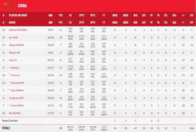 韩旭18分8篮板,李梦17分3篮板3助攻,李月汝13分9篮板1助攻,杨力维12分1篮板3助攻,武桐桐12分3篮板4助攻。