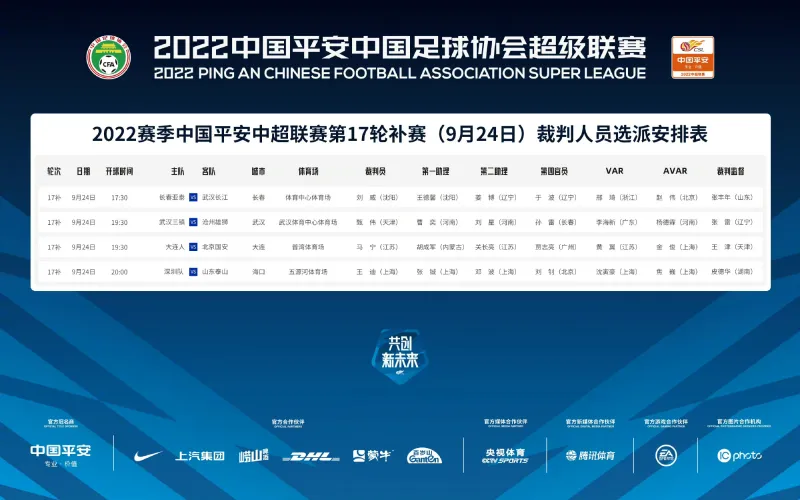 虎扑09月24日讯 2022中国平安中超联赛第17轮补赛(9月24日)裁判选派结果公布,具体安排如下:
