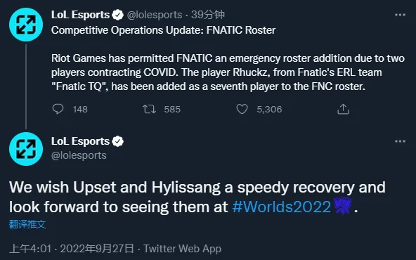 由于Fnatic队内两名选手感染新冠,拳头游戏允许Fnatic临时征召选手作为紧急替补加入队伍大名单。目前Fnatic在ERL(西班牙地区联赛)的队伍FnaticTQ的辅助选手Rhuckz已经加入Fnatic征战S12的大名单。