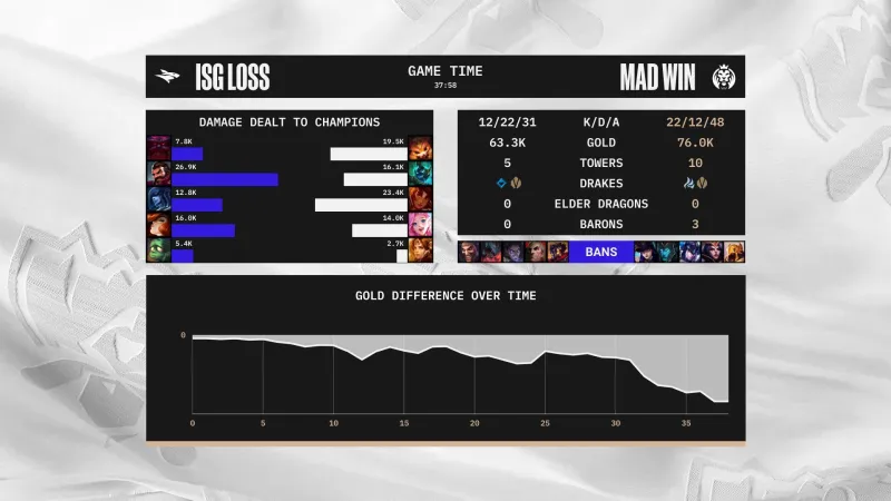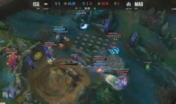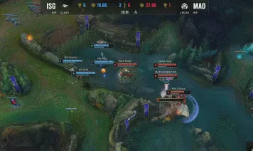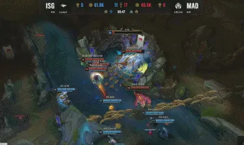 25分钟MAD强开大龙,ISG依靠大招Combo打出2换5团灭,此时MAD仍然拥有3K经济优势;