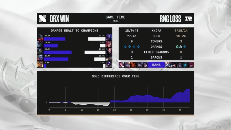 18分钟,小龙团战RNG阵型被分割,DRX打出团灭。