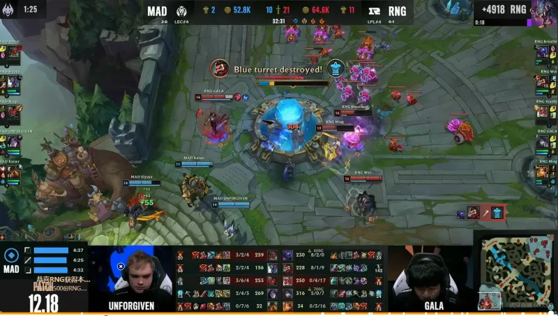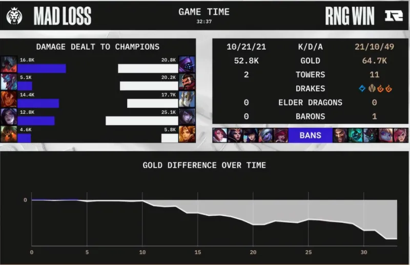 32分钟,RNG三路齐推,正面团战MAD溃败,RNG一波终结比赛。