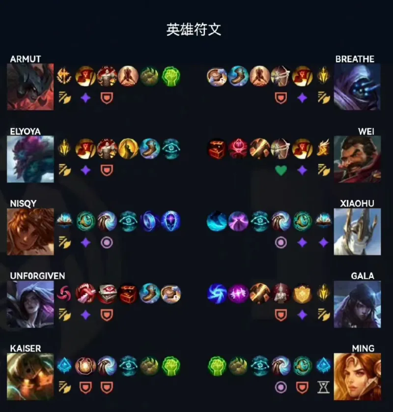 RNG选用:Breathe武器大师、Wei男枪、Xiaohu加里奥、GALA厄斐琉斯、Ming日女