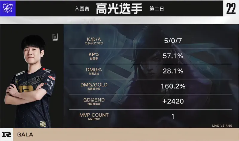 10分钟,MAD强行拆塔无果,RNG追击之下完成一波0换2团战,男枪收获双杀。