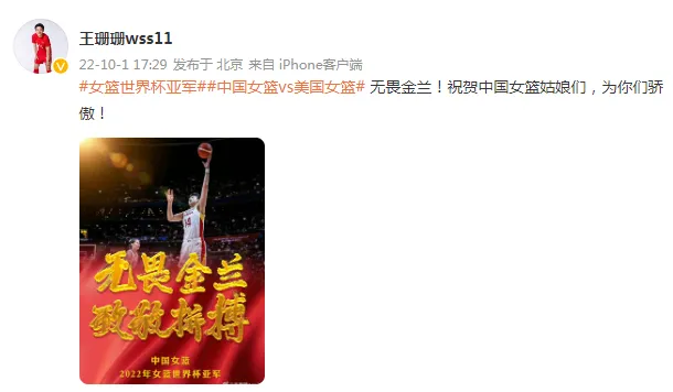 王珊珊:无畏金兰!祝贺中国女篮姑娘们,为你们骄傲!