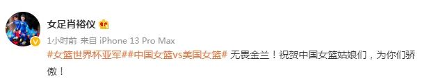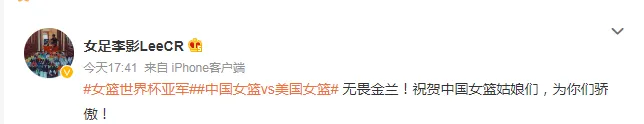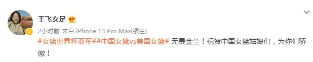 虎扑10月01日讯 在今天进行的2022女篮世界杯决赛比赛里,中国队虽然不敌美国队拿到亚军,但仍然创造了历史最佳战绩。中国女足的许多队员也在社媒上恭喜了中国女篮。