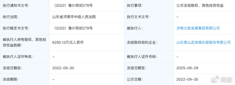 虎扑10月02日讯 据《闻旅视界文化科技》报道,来自企查查的信息显示,9月30日,山东省济南市中级人民法院公示了一条文号为(2022)鲁01民初279号的股权冻结通知书,济南文旅发展集团有限公司(以下简称“济南文旅”)作为被执行人,其持有的山东泰山足球俱乐部股份有限公司(以下简称“山东泰山足球俱乐部”)6250.13万元权益数额被冻结,冻结日期自2022年9月30日至2025年9月29日。