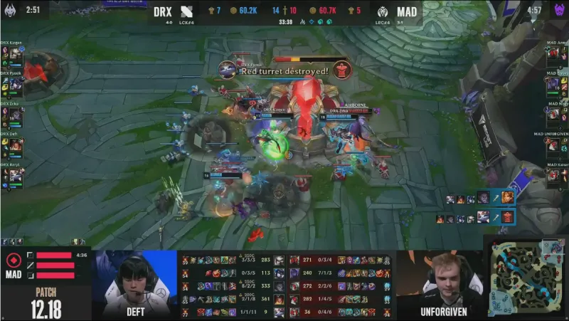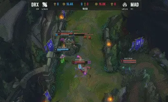 14分钟DRX中路发起攻势,但MAD冷静反打由Elyoya虚空女皇再拿一颗人头;