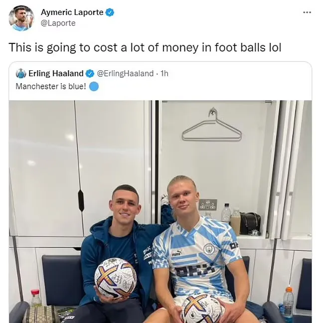 哈兰德还晒出了自己和福登的合照,两人各拿一个签过名的纪念球,拉波尔特随后也转发了这条推文。