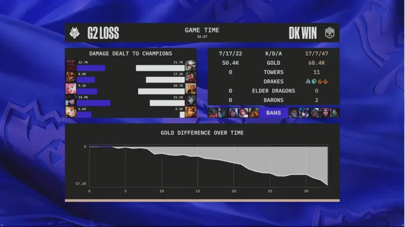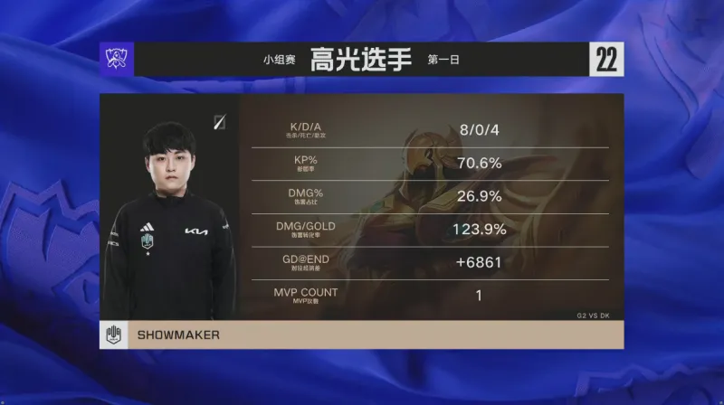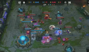 8分钟河道交火,ShowMaker沙皇完美回旋推击碎G2阵型,DK打出1换5团灭G2;