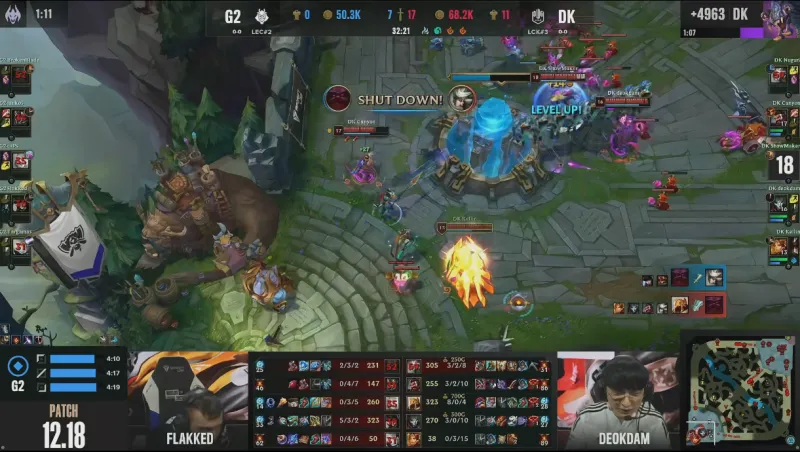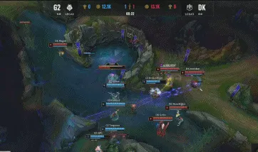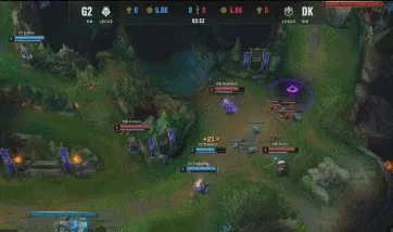 4分钟双方打野均来到下路,DK集火击杀拉克丝拿下一血,G2也收下蕾欧娜人头完成1换1;