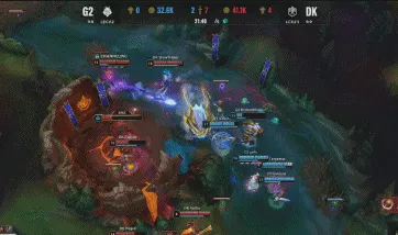 22分钟双方爆发火龙团,Nuguri和ShowMaker各取双杀率领DK打出1换5团灭,DK此时已经拥有超过1W经济优势;