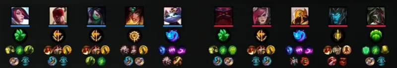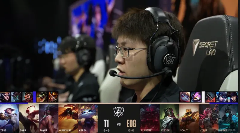 T1选用:Zeus剑姬、Oner盲僧、Faker阿卡丽、Gumayusi希维尔、Keria猫咪