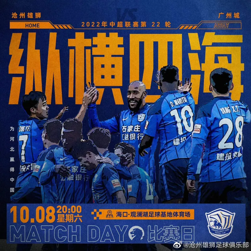 虎扑10月08日讯 中超第22轮,沧州雄狮主场迎战广州城,赛前,双方公布了首发阵容。