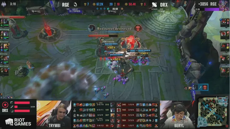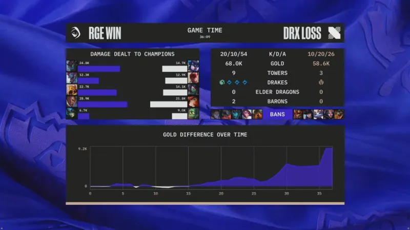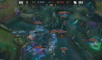27分钟RGE凭借双前排骑脸打出0换2,大小龙双收后将经济优势拉开到5K;