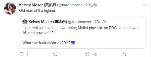 Moser:我才意识到我从Meiko16岁起就一直在看他在EDG打比赛,而现在他已经24岁了,这太难以置信了,他是个传奇!