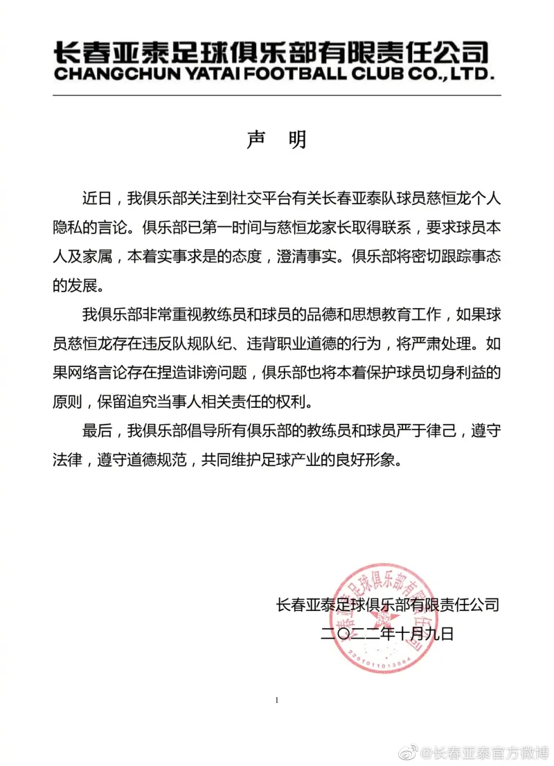 亚泰俱乐部声明如下:近日,我俱乐部关注到社交平台有关长春亚泰队员慈恒龙个人隐私的言论。俱乐部已第一时间与慈恒龙家长取得联系,要求球员本人及家属,本着实事求是的态度,澄清事实。俱乐部将密切跟踪事态的发展。