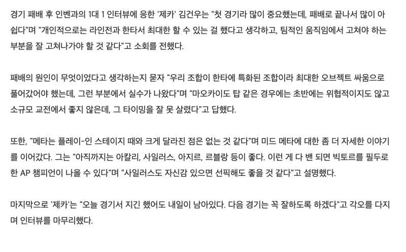 当被问到失利原因时,Zeka选手表示,“我们的阵容是团战阵容,应该尽可能通过地图资源来打开游戏局面的,但是出现了很多失误。上单大树在初期并没有什么威胁、在小规模交战中也不好,但是我们未能利用好那个时机。”