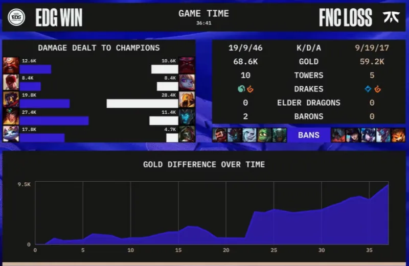 35分钟,奥恩先手开团,沙皇进场将维克托击杀,但后续团战EDG大获全胜,一波终结比赛。
