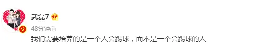 虎扑10月12日讯 在中国足球名宿区楚良发长文对于中国足球青训提出自己的看法以后,武磊也在个人社媒上转发了区楚良的长文并在其中摘抄了一句话。