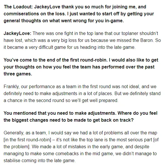 JackeyLove:老实讲,我们整个战队在第一轮的表现并不理想。我们肯定需要在很多地方去做调整。但我们在第二轮肯定是有机会的。我们会做好充分准备。