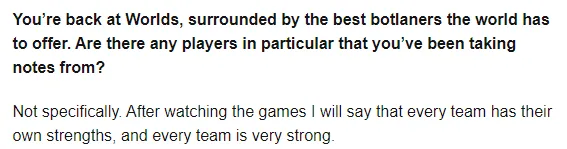 Q:你们再次打进世界赛,周围都是世界各地最好的下路选手,你有没有印象特别深刻的选手?