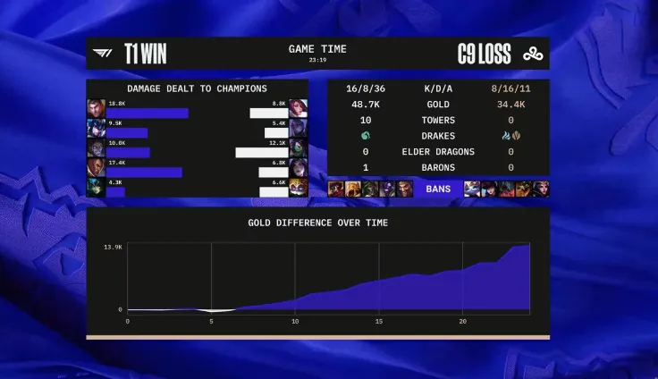 16分钟:T1上路与越塔击杀对方剑姬和大头后塞拉斯被换掉,随后剑姬撤退不及也被击杀。