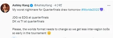 虎扑10月16日讯 目前晋级S12淘汰赛阶段的队伍已经产生了六支,分别是T1、EDG、JDG、DK、DRX和RGE。来自LPL赛区的有两支队伍,来自LCK赛区的有三支队伍。对此,著名韩媒记者Ashley Kang对八强赛可能会是两大赛区的内战战场产生了担忧,大意如下: