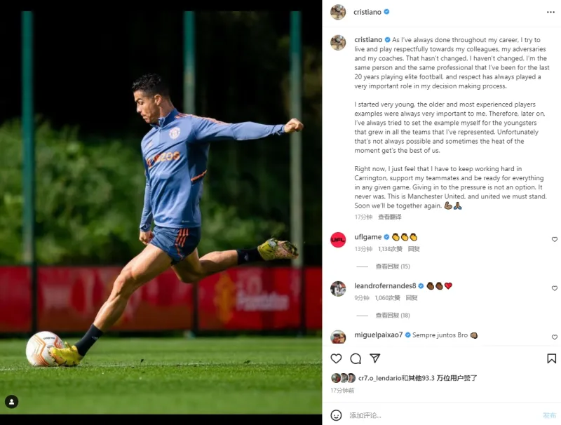 虎扑10月21日讯 在经历了与热刺比赛的提前离场,以及今天遭到曼联移除出大名单和停训的处罚后,曼联球员C罗在ins上发文进行了回应。