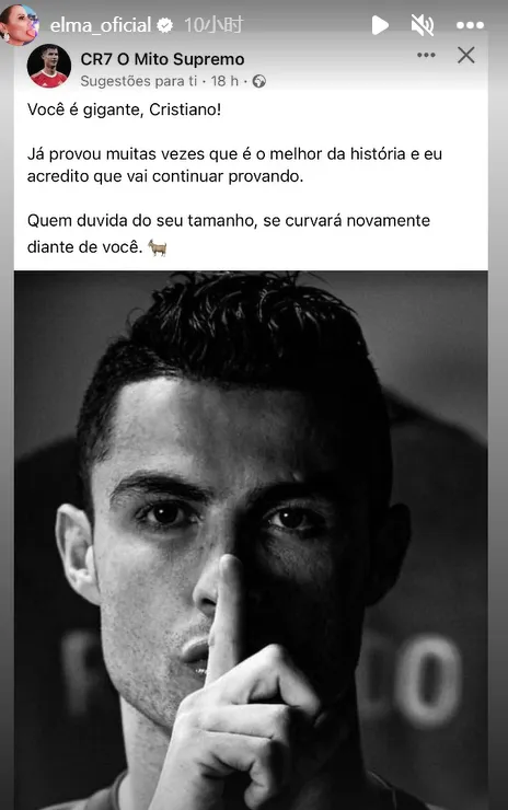 虎扑10月21日讯 在今天凌晨,曼联官方宣布,C罗不会出现在对阵切尔西的大名单中。在大约10小时前,C罗大姐Elma Aveiro更新动态晒图力挺了弟弟。