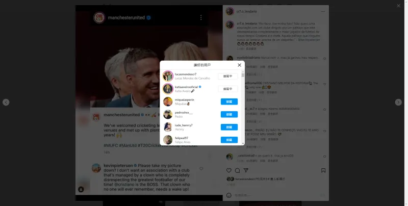 转发著名板球运动员凯文-皮特森在曼联官推下的评论,皮特森是C罗粉丝,他表示:“请撤下我的照片,我不想和一个完全不尊重我们这个时代最伟大的足球运动员的小丑经营的俱乐部有联系!克里斯蒂亚诺很伟大,那个没人会记得的小丑需要被唤醒。”