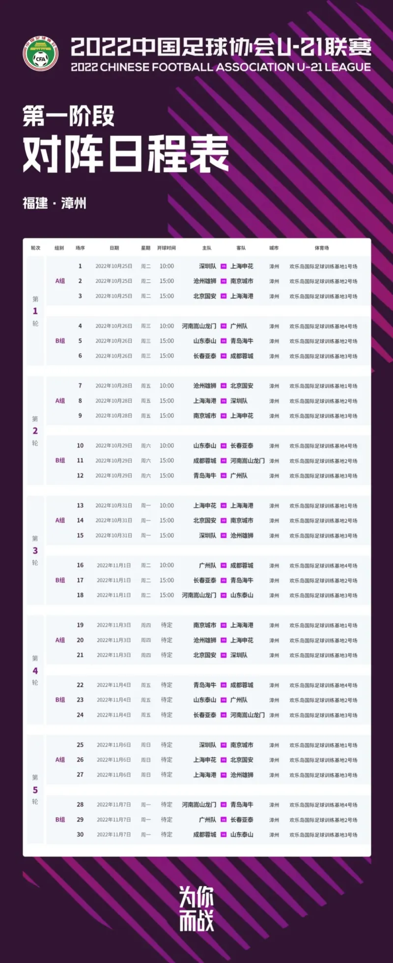 虎扑10月22日讯 北京时间10月22日,中超联赛官方宣布了U21联赛分组及赛程,海港申花同组,第一阶段共5轮比赛。