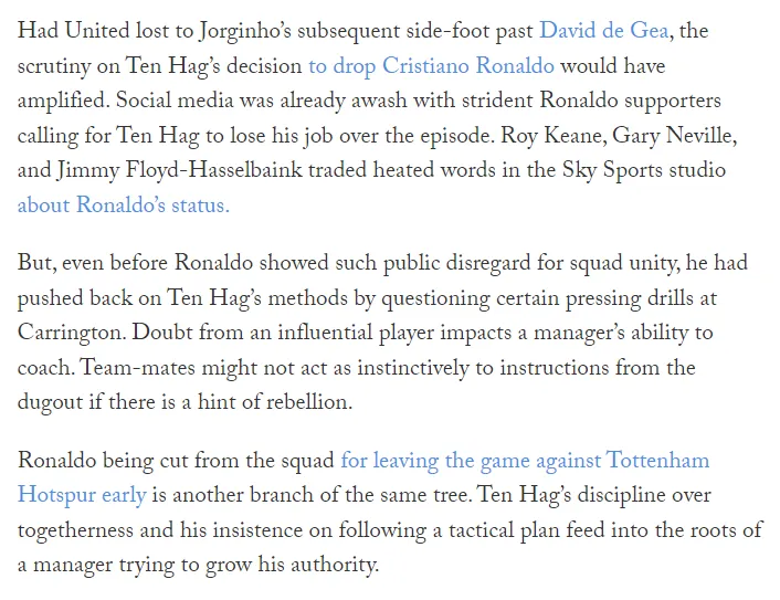 C罗因提前离场而被排除出大名单则是这一事件的另一个因素,滕哈格对于球队的纪律要求以及对于战术计划的执行力的要求,正是他希望牢牢抓住自己作为曼联主教练权威的方式。
