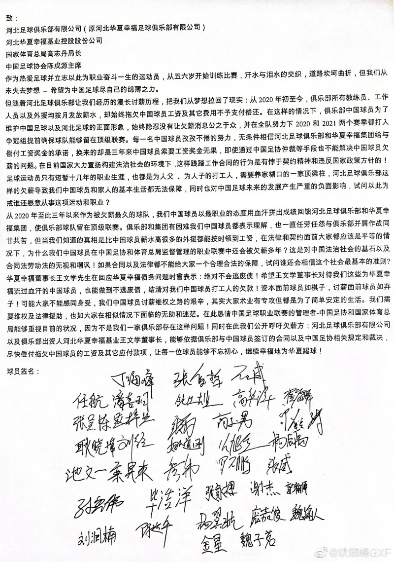 尊敬的华夏幸福王文学董事长:不知道您是否记得我来华夏第一年因为没给我报名您提出经济补偿但我拒绝了。作为祖籍河北的球员,回到家乡就想踢好球。我们都曾是华夏幸福打工人,更是家里顶梁柱。看着兄弟们走投无路站出来讨薪却毫无回响,我也想知道我们到底该怎么办?拿着劳动合同却讨薪无门这不仅是对球员的伤害对行业的打击,更有悖于社会主义法治建设的方向。打工人在资本面前永远弱势,无奈之下只有求助舆论和社会各界的支援。我国健全的法制体系和对民生福祉的全面保障是我们最大的底气,我们依旧相信相关部门能够让欠薪乱象有法可治。别让我们投身并挚爱的行业一直沦为笑柄,别让欠薪成了理所当然,成了法治基石上的蛀洞。