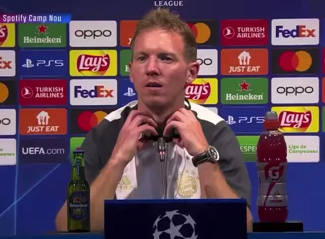 虎扑10月27日讯 拜仁主教练纳格尔斯曼赛后接受了西班牙媒体的采访,他和哈维同时参加新闻发布会。