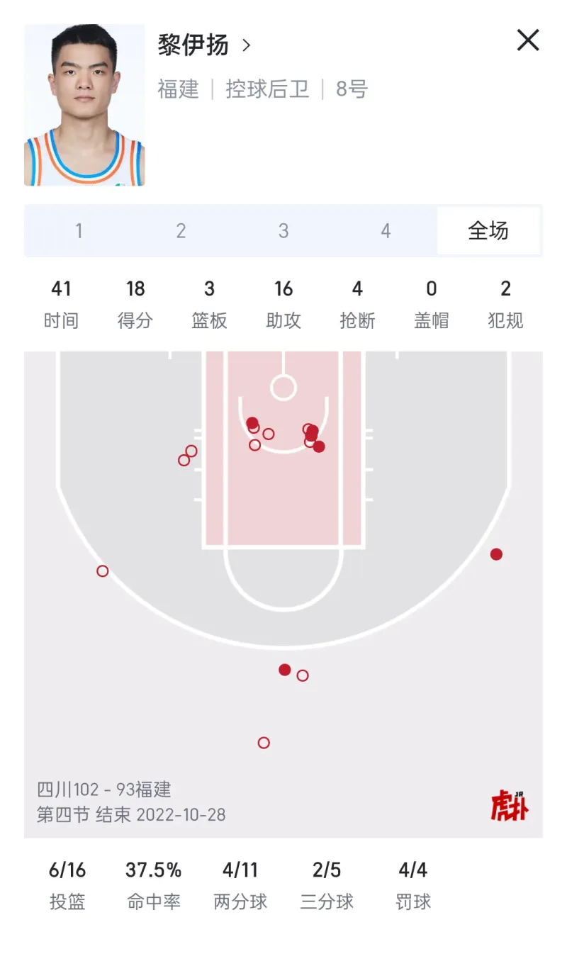 虎扑10月28日讯 2022-23赛季CBA常规赛第8轮,四川男篮102-93战胜福建男篮。此役,福建队球员黎伊扬贡献16次助攻,平本赛季单场新高(孙铭徽本赛季曾单场16次助攻)。